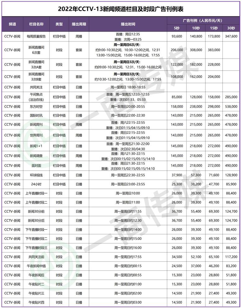 以下是一商传媒为您提供的2022年CCTV-13新闻频道央视广告价格,可以优先选择时段,为您匹配高性价比的广告资源,制定整合性的媒体投放策略及优化的量身定制传播方案。同时还提供媒介研究、品牌策划与广告创意、媒介计划与购买、节目及影视剧植入、互联网整合营销等全方位的整合传播服务。