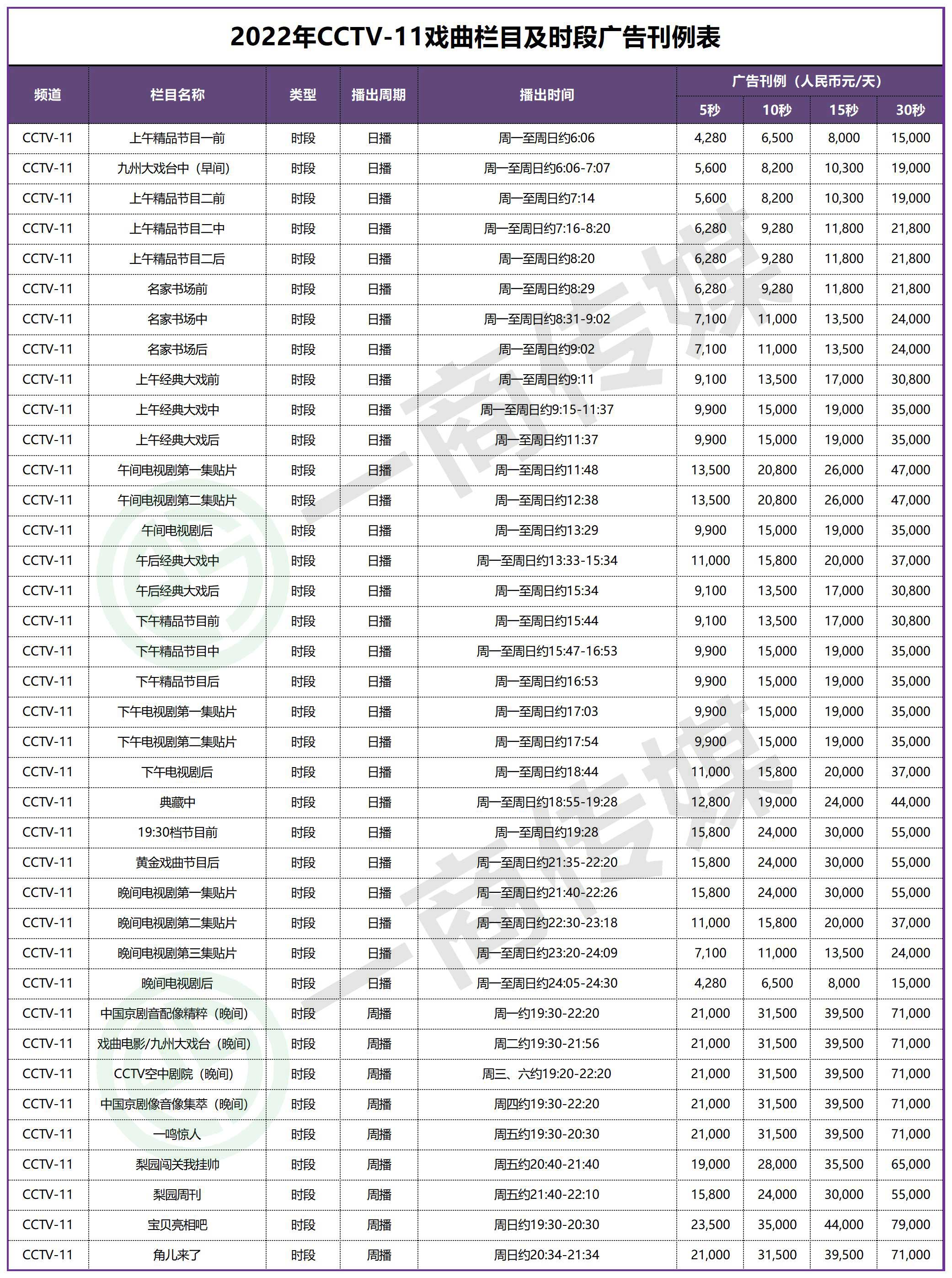 2022年CCTV-11戏曲频道广告价格表