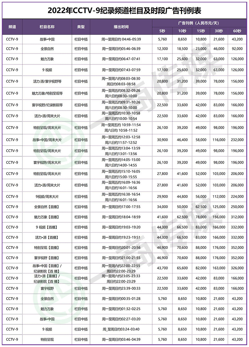 2022年CCTV-9纪录频道央视广告价格表