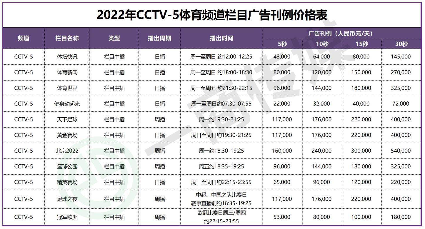 2022年CCTV-5体育频道广告价格表