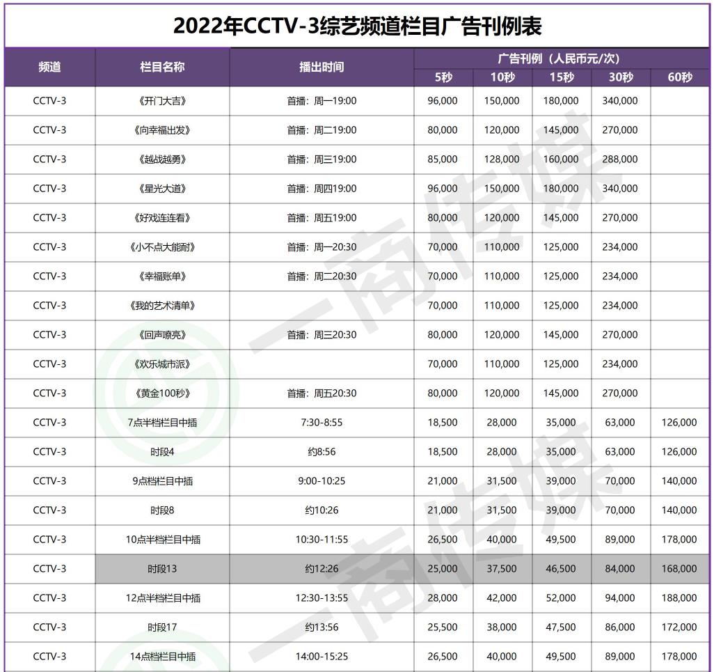 以下是一商传媒为您提供的CCTV-3综艺频道2022年广告价格,可以优先选择时段,为您匹配高性价比的广告资源,制定整合性的媒体投放策略及优化的量身定制传播方案。同时还提供媒介研究、品牌策划与广告创意、媒介计划与购买、节目及影视剧植入、互联网整合营销等全方位的整合传播服务。