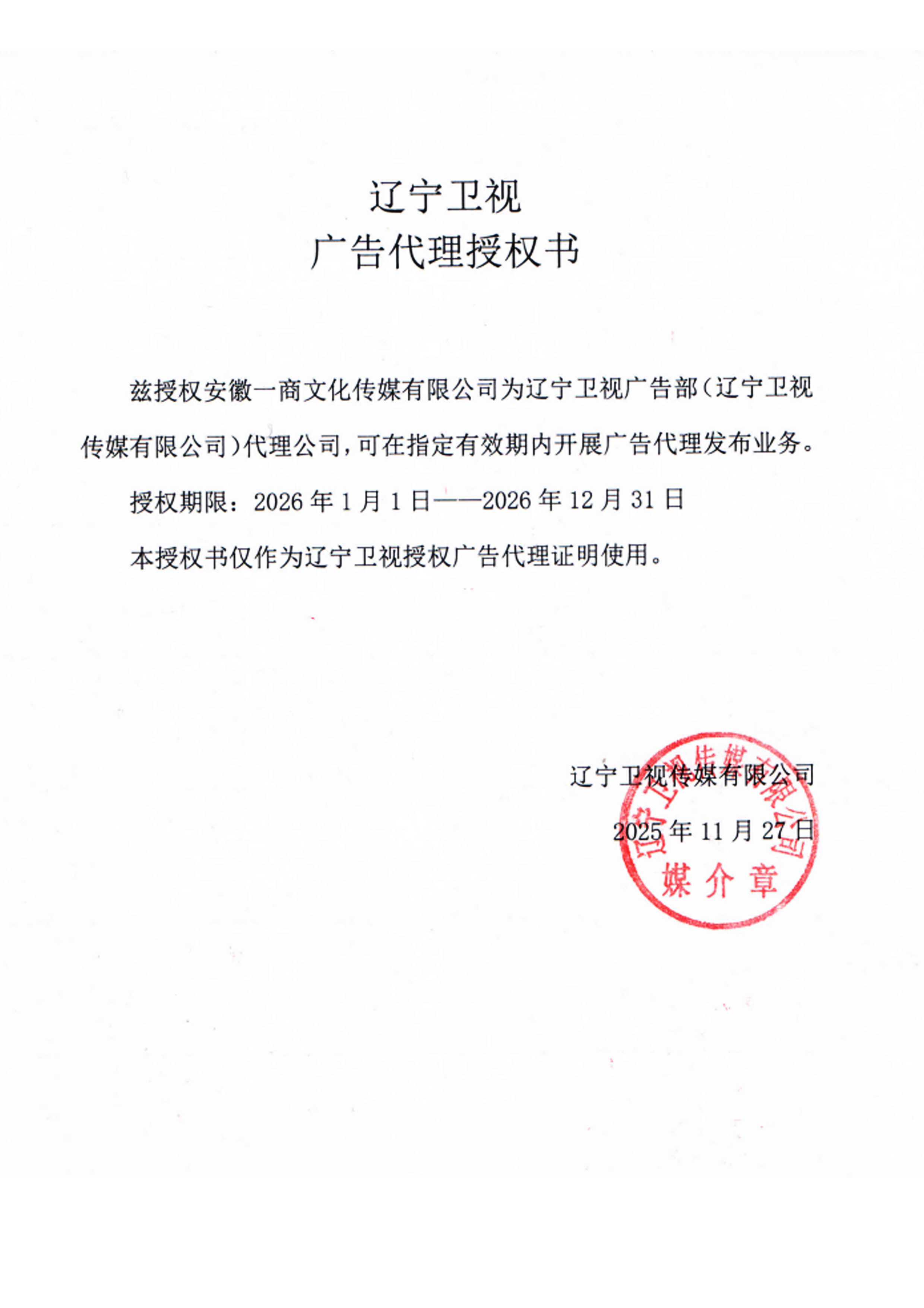 一商传媒——2026年辽宁卫视代理证