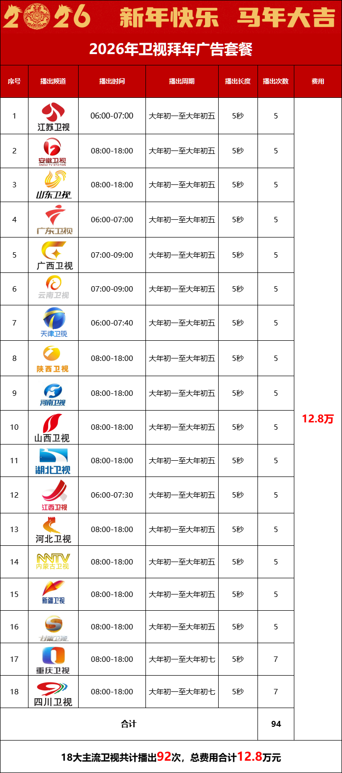 18大省级卫视拜年祝福投放套餐,源头价格,欢迎咨询投放和代理。